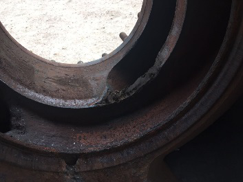 (2)2號隔板端面***大磨損深度0.60mm,修復外圓徑φ358.888mm,修復后的葉輪凸臺高出端面未磨損基準面0.5mm,修復面積65.27dm2。